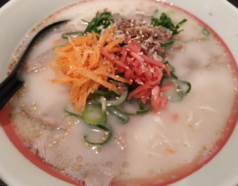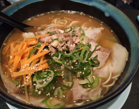 这家每次路过都生意很好,到店的时候只有老板娘一个人在打理,从迎接顾客、点餐、上茶水、到煮面条、上餐、收拾餐具、清洗餐具就一个人完成,还面面俱到,真是个能干的女人。有好几种汤底味道可以选择,我要的是大份的豚骨汤底,分量很足,汤很鲜美,很满足的一餐。伙伴点的是普通分量,咖喱汤底的也是很满意。