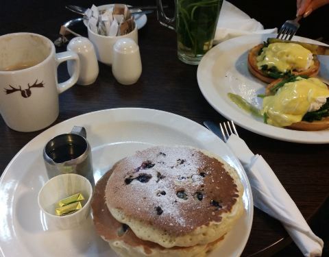 Coffee is perfect - Pancakes & eggs Benedict bagels are both incred...
