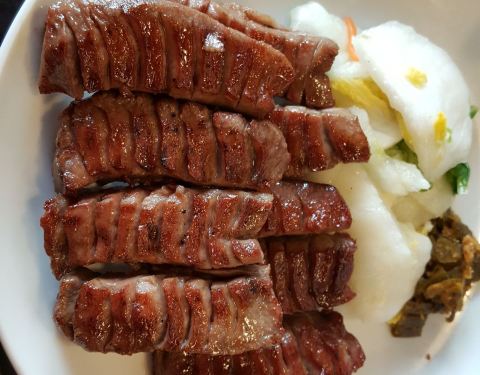 慕名而来的,我们点了一份牛舌套餐,牛舌看上去卖相不是特别好,但是真的还挺嫩的,第一次吃,整个套餐里面有三份肉和一点蔬菜,性价比还可以吧,毕竟这边的牛肉挺贵。