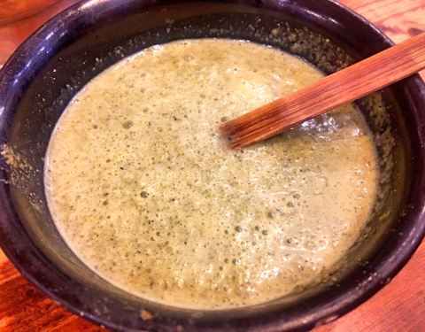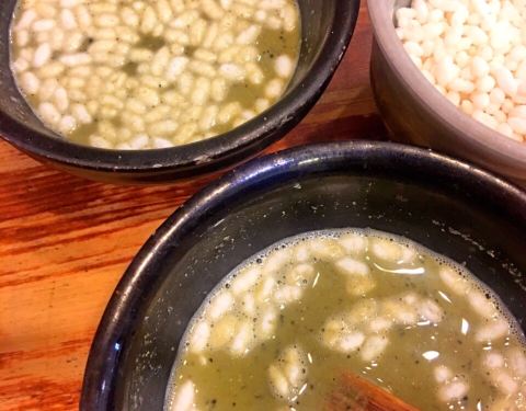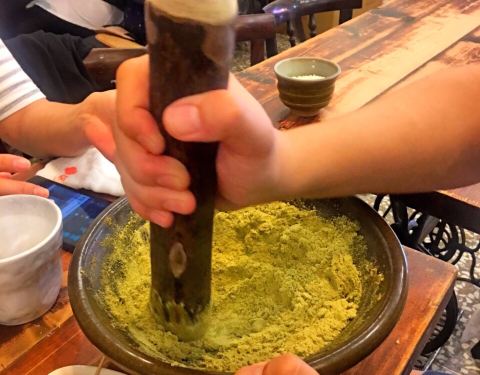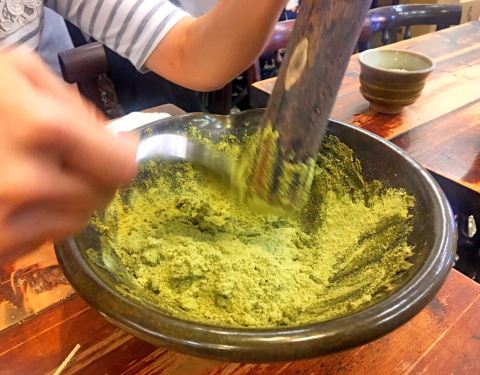然後再倒另外現成磨好的粉進去一起再次擂,最後一部分泡了熱茶剩下的部分做了擂茶冰沙,配上米泡,好...