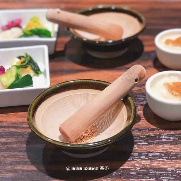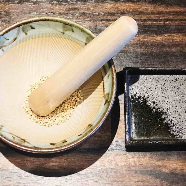 鹿儿岛产特选六白黑豚套餐。两个人点一份套餐就足够了。一大块炸猪排,切成小块。豚肉选肥瘦相间的吃起来才更美味,肥肉部分牙齿咬下去一泡油,瘦肉部分有韧性有嚼劲,搭配自己研磨粉碎的白芝麻和炸猪排酱,综合了油腻感,也增添了鲜味。