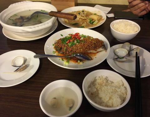 豆酥鳕鱼、炒桂竹筍、三杯中卷、蛤蜊汤!很美味!两个人吃很饱,人均100人名币。