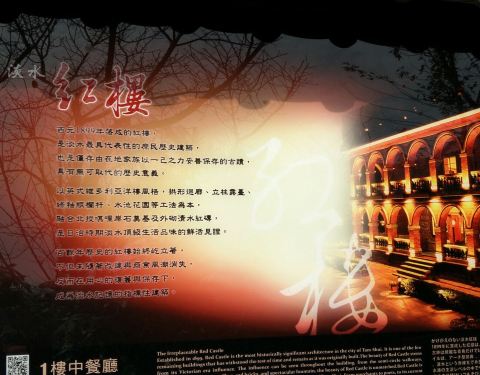 一家具有百年历史的淡水红楼(建于1899年),最最最早期是当地经营船头行的富商建于清末的宅第,建材多从中国引进,有别于其他外国人建造的砖墙洋楼,在建筑上运用北投出产的唭哩岸石做为一楼内墙,二楼内墙及外...一家具有百年历史的淡水红楼(建于1899年),最最最早期是当地经营船头行的富商建于清末的宅第,建材多从中国引进,有别于其他外国人建造的砖墙洋楼,在建筑上运用北投出产的唭哩岸石做为一楼内墙,二楼内墙及外观墙面则运用不同形状的清水红砖做变化,是同时期洋楼建筑少见的。红楼内除了可以参观的建筑之外,最最最棒的就是有台湾菜式餐馆、展览区、咖啡厅,也是许多遊人的必访之地!