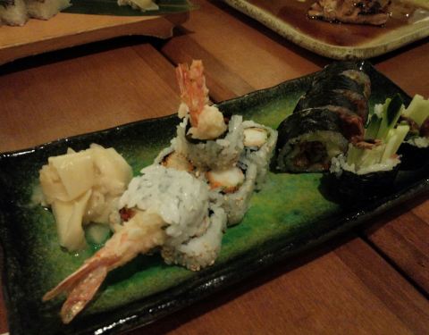 ソフトシェルクラブ巻(画像右)は日本では食べられない料理で旨い!オススメ。Soft Shell Crab Roll (right side)