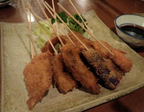 串揚げ盛り合わせ。美味しい!揚げ物に串を後から刺してあるのが惜しい。