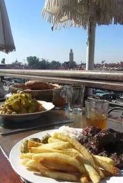 Muy rico el Couscus de pollo, el pincho moruno y el té. Muy buenas vistas de la Plaza Djemaa El-Fna desde la terraza de arriba (2 planta). Más caro de la media aunque merece la pena por la calidad.