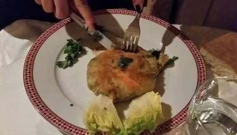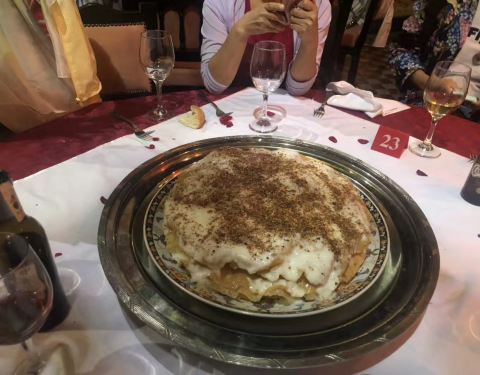 这家真的比较做法比较传统. 菜单看起来简直要人命 阿拉伯语 法语 关键 英语真的十分的花式 看着很费眼力. 我们提早半个小时到的 不能进去坐着等 一定要到了12:30才能进去坐着. 点了传统汤;牛肉蔬菜塔吉;色拉(菜单上就一种传统色拉). 这里的沙拉就是很多小碟菜 . 牛肉塔吉挺好吃的.配的蒸小米.服务态度一般.