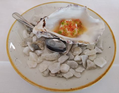 开胃菜是用牡蛎壳摆盘的鱼籽,特别鲜美;餐厅环节很好,可以看海。提前预定好座位,早早来到餐厅