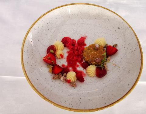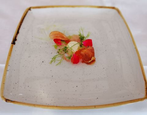 餐厅环节很好,可以看海。提前预定好座位,早早来到餐厅。预定的是四道式餐,一道前菜、二道主食、一道甜点。开胃菜是用牡蛎壳摆盘的鱼籽,特别鲜美;前菜是龙虾肉;主菜是两种鱼块,第一道清淡一点,第二道浓香一些;甜点是草莓三吃,其中的草莓酱冰镇过,特别爽口。
