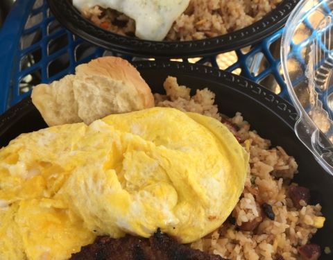 Get hamburger patty with fried rice, egg, and bun. The best breakfast I've ever had...
