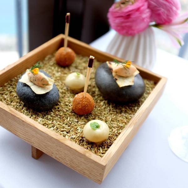 石头上的是冷餐的肉类,造型非常精致午餐有3道式和4道式