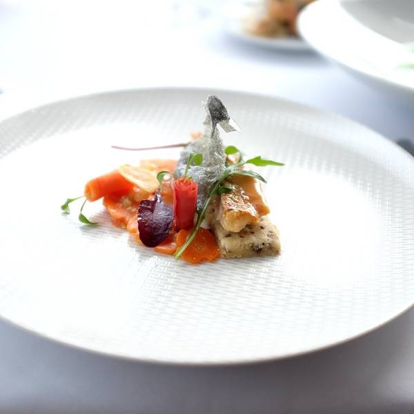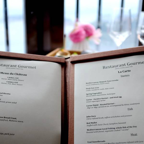 米其林一星餐厅Chateau Eza位于埃兹小镇山上,靠山面海。餐厅的露天座位享有无敌海景,即使坐在室内,一整面偌大的玻璃窗同样可以让你欣赏大自然的美景。晚上餐桌上会点起蜡烛,伴着月光欣赏地中海美景也是尤为浪漫。餐厅的菜式以当地特色的法国菜为主,午市的套餐性价比较高,有52欧三道菜和62欧四道菜可选,推荐62欧的套餐。这里点一杯餐前酒还会送一小篮子小吃。推荐地中海特色的羊鱼或者红鲣鱼(red mullet)做主菜,另外加入芦笋的意大利饺子料理(langoustin ravioli)也很不错。