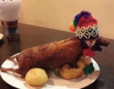 带游客品尝秘鲁特色烤豚鼠Cuy! 初见这道秘鲁菜你可能是拒绝的,但如果你抱着“反正到了当地就试着吃吃”的心态小尝一口,就会惊叹:这是一道“看着吓人、放进嘴贼好吃”的神奇菜肴!因为酥炸的口感,加上调味带出的肉香,再配上印加可乐!简直太棒!来秘鲁的游客不要错过哦!