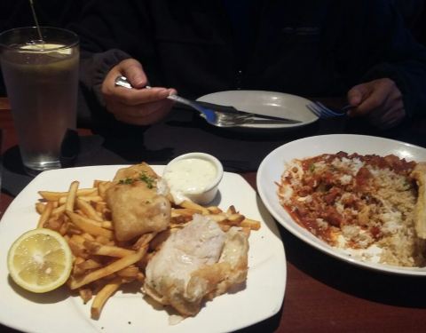 - 第一餐每人点了份不同的食物,美国特色食物餐及土豆鱼排,好吃,但没吃完打包了,第二天就只要一份餐食刚好