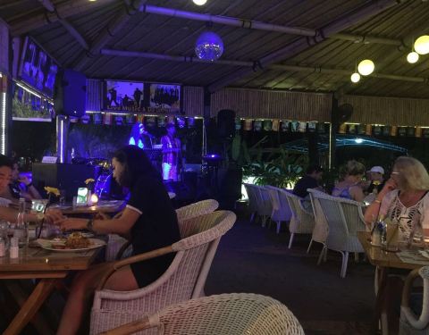 有歌手驻唱,气氛不错。大部分都是欧美客人,比较热闹。印尼炒饭还不错,生蚝烤得不错,其他的也可以。