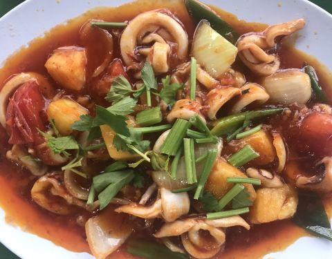 点了四个招牌菜,黑胡椒螃蟹,40人民币100克,我们的螃蟹是700克。鲜鱿鱼,贡贡点了两次,第一次点了一盘小份的,上来品尝后感觉特别好吃,孩子和先生都非常喜欢,就又点了一盘大的,一大盘大概196人民币。还有一...点了四个招牌菜,黑胡椒螃蟹,40人民币100克,我们的螃蟹是700克。鲜鱿鱼,贡贡点了两次,第一次点了一盘小份的,上来品尝后感觉特别好吃,孩子和先生都非常喜欢,就又点了一盘大的,一大盘大概196人民币。还有一盘炒米饭,味道也挺好。我们两大一小花了728人民币,不过没有吃完,吃撑了,打包带走了。其实我们早上去过一次了,风景特别美!还可以看到店里的伙计们在水里捕东西。
