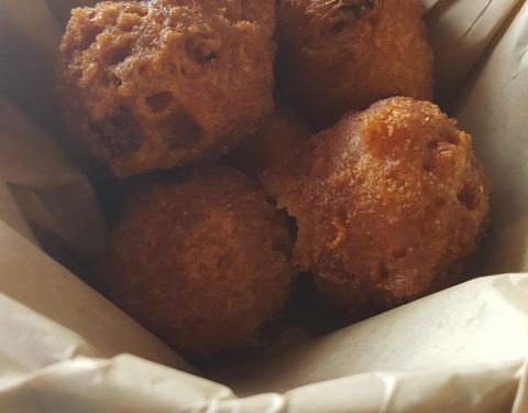 Near ranger outlets. Brisket was a Tad dry but good flavor. Blackend fish with sweet potato fries was great. Hush puppies are a decent size and tasty. addition. Plenty of seats. Overall a good meal.