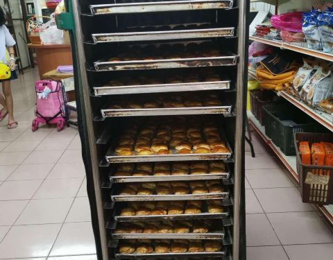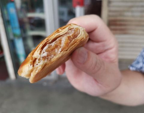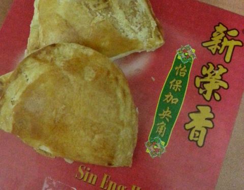 在怡保新街场逛时,发现前面一家商店有许多当地人在排队。我上前一看,是一家老饼店,好像在卖新鲜出炉的饼。我就赶紧加入队伍 先别管卖什么,反正这么多当地人在排队,一定是好吃的 原来是当地最著名的咖央角(咖椰角)!每天下午大约三点出炉,会有好多人来排队等。看看旁边的架子还有刚烘好的咖央角,其实才开始卖不到20分钟,已经卖掉一大半了!也难怪,因为顾客都是10个、20个的买! 我一买到咖央角就迫不及待的拿来吃,还是热乎乎的。外皮很酥脆,咖椰馅浓郁香醇,不过我觉得有点太甜。但是,非常好吃!搭配一杯怡保咖啡☕️ 更完美! 这家店是老字号,有三间分行。这家的咖央角最好吃,现做现卖。店里还有售卖各种传统糕饼,真是琳琅满目。