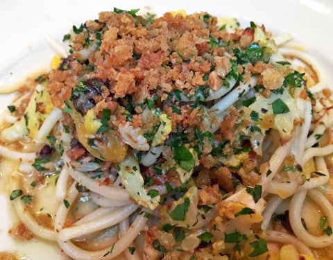 Just all kinds of goodness. Bucatini with cauliflower, almonds, currants, saffron, anchovy, and wild fennel
