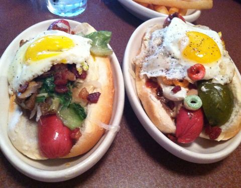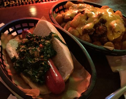 Dive bar w live music and TONS of toppings to create-your-own specialties. Pictured here: beef dog w bacon-laced southern greens & ballpark mustard + tater tots w homemade sloppy joe & nacho cheese.Dive bar w live music and TONS of toppings to create-your-own specialties. Pictured here: beef dog w bacon-laced southern greens & ballpark mustard + tater tots w homemade sloppy joe & nacho cheese.