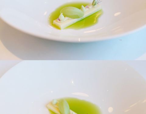 餐前面包是Sourdough和White Ciabatta 前者清冷酸香 后者外脆内韧松软热乎 自制黄油有着柔软如冰淇淋般的质地 点缀一小撮海盐 然后是一道Gravlax鱼肉炸丸子的Amuse Bouche 第一道是Toque招牌 唯一常年不变的菜式...
