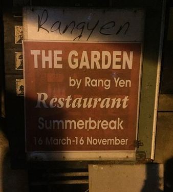 The restaurant is located in a very nice garden. The staff is friendly and the place is very quiet. ***WATCH OUT*** The map on Trip advisor is wrong and the restaurant is 600-700 m more in the north. You will find a green sign indicating "The Garden" and then there is a small gravel road that will lead you directly to the restaurant. If you check google map, the adress is right. Definitely worth looking for it !