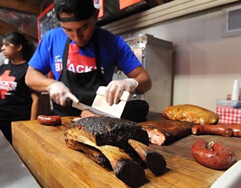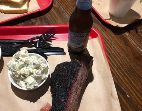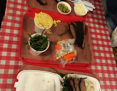 去的时候估计正好碰到音乐节,前面去了两家烤肉 店都是队伍排到吓死人。第一领略了原来老美排队 也是很厉害的。 更有意思的是,在第二家碰到了在第一家问我路的 小情侣。估计大家都是按着app排序找的。 也是类似快餐式的点单。 烤肉非常香而且很嫩,非常棒 猪肋排有点甜,好吃到没朋友。德州是肉食动物的 天堂。 份量大没吃完,打包夜宵。 有自己的停车场,开车不用太担心。