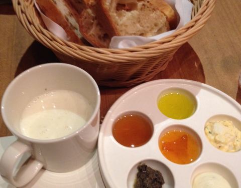 ランチセットがおすすめ、5種類のパンお代わり自由、6種類のディップを楽しめる
