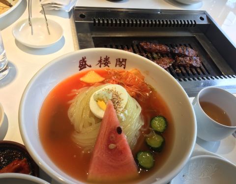 这家店的肉本身是腌制过的,烤的很有滋味,更偏日本风味,较韩国烤肉要淡很多。冷面较粗,也更硬一些,汤不那么酸,总体来说还是不错的。
