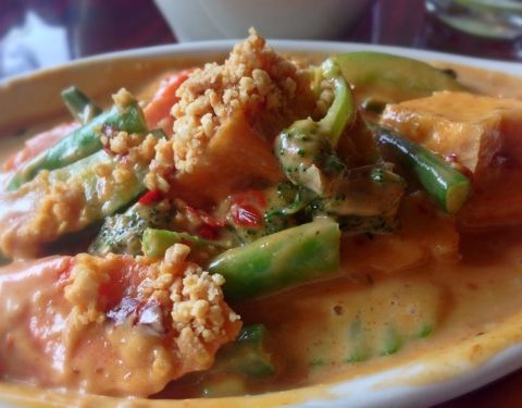 Red curry with pork. Hot. Fried sweet potato appetizer.