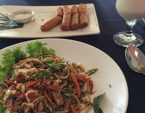 中午想找个餐厅吃饭好几家还没营业,这家营业看看人还挺多就来了。 冬阴功汤的味道有点不伦不类了,一点也不开胃也不酸呀也不辣,这是刷锅水吧! 春卷到是还可以,就是等很久,不知道是他们忘记做了还是现包的。