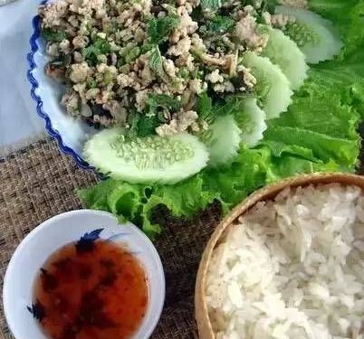 普(碎肉):是一种颇具老挝民族特色的莱肴。一般的做法是:将新鲜鱼肉、猪肉、鸡肉、牛肉等剁细,拌以辣椒、香菜、番茄、柠檬、鱼露等多种作料制成,味道鲜美独特。