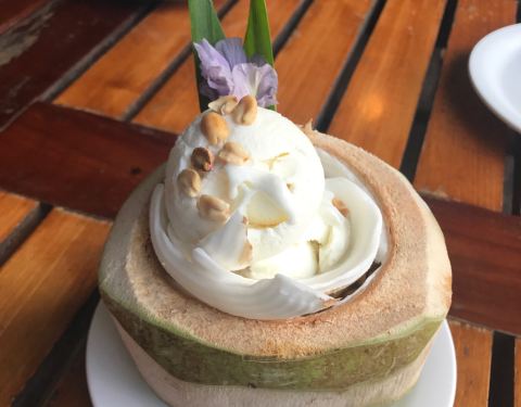 这顿花费一共260元软妹币,价格不算贵,毕竟有蟹、有鱼还有虾,环境还这么优美的情况下。 我们两人点了一杯芒果椰子冰,一份芒果糯米饭。
