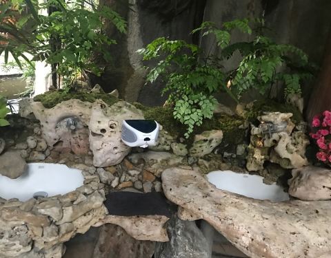 走进餐厅就像走进了一片茂密的森林。大厅很高很大,周边有瀑布流水,池塘鲜花,把客人包围在中间,就餐环境绝佳。就连厕所也修建得和整个森林的主题融为一体,自然简朴。