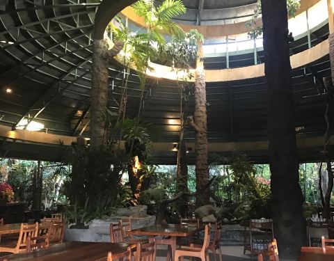 距离夜间动物园很近的餐厅,餐厅中随处可见郁郁葱葱的热带植物,就连洗手间也是热带雨林风格。除了菠萝饭、冬阴功汤,还有泰北特色菜番茄辣肉酱蔬菜盘、蝶豆花饮料等等。