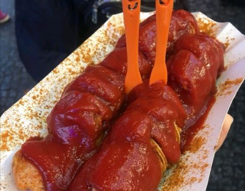Die Currywurst mit extra Curry, scharfer Sauce und Chilipulver ist verdammt lecker. Natürlich ohne Darm. Und sehr günstig.