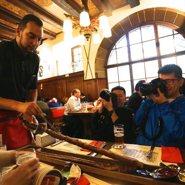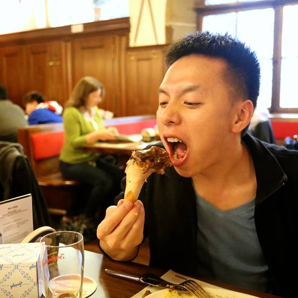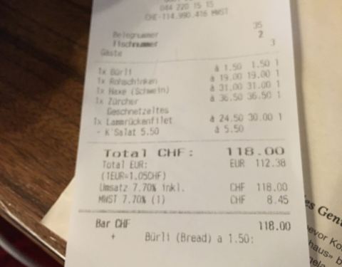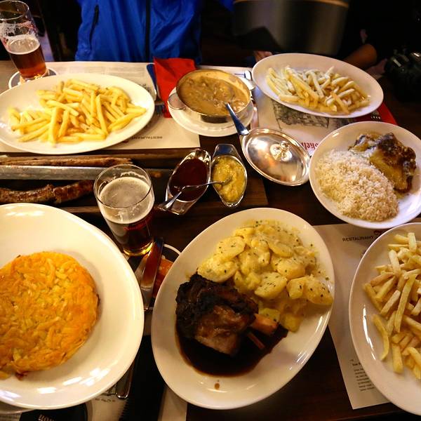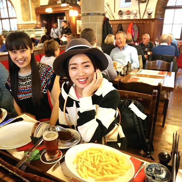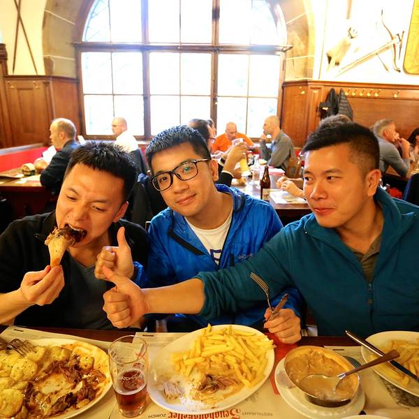 不过让我记忆犹新的就是一进餐厅迎面而来的暖气让我感到亲娘一般的温暖,本来已经冷的哆嗦几乎失去直觉的双手终于开始好转~虽然不懂这是什么鬼,但一进餐厅还是有惊艳的感觉,特别有特色。一个半圆周的卡座,不过waiter没有给我们带到这个位置。连餐厅的waiter都是这么酷,举起相机给他拍照他还很配合的给我们摆了一个pose。我一直很喜欢德文,虽然看不懂,但觉得特别漂亮特别有逼格哈哈。在瑞士,即使上了一定年纪的老爷爷也依然在做waiter,用自己的劳动赚钱,这点真的比国内很多想不劳而获乞讨的老人好了太多。我们点的这家餐厅的名菜:市长宝剑,其实就是两根非常大的德国香肠,香肠被宝剑形状的刀串起,上菜后可以看到香肠还在冒着热气,服务生会为我们现切。经过我们亲口尝试,其中上面一条特别美味,鲜嫩多汁,下面一条偏干,味道一般,我们最后还没吃完。香肠配有两种沙司酱可以蘸~上菜后,秉持着相机先吃原则的我们自然少不了一阵快门狂扫哈哈,场景挺壮观的。我们一人点了一杯德国扎啤,亲测味道不错,特别爽口~这个就是店内另一道名菜德国猪肘了,味道很好,就是多人分享有点难切哈哈,还好ethan很贤惠的承担了为我们切猪肘的重任!6个人点了一大桌,大家的第一顿晚餐就是share的,连有洁癖的兔子也愉快的融入其中,我们这个有爱的小家庭就这样一点一点的开始形成啦~这是我点的安哥拉斯小牛肉配米饭,作为一名肉食动物&自带标准中国胃的我怕西餐吃不惯还是保守的点了一份“肉+饭”的组合哈哈。每道主食都可以选择配菜,土豆饼或薯条或沙拉之类,亲测薯条比较好吃,土豆饼一般,我们最后剩的最多。cheers!第一顿晚餐在和谐而圆满中度过啦!服务生很亲切的为我们拍下了这一张合照,赞!