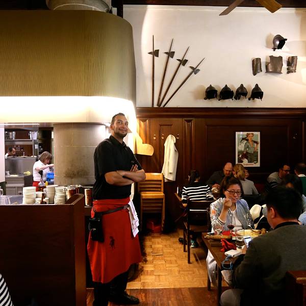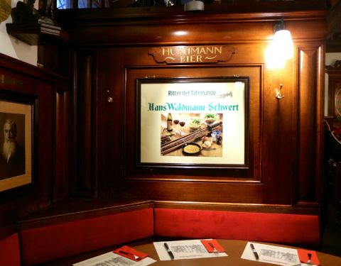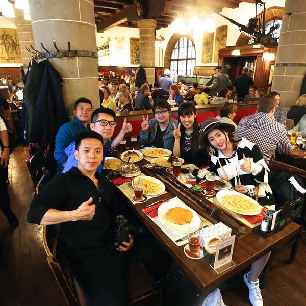 这是一家非常有历史年代的一家餐厅,由原来的军械库地窖改造而成,位于班霍夫大街的一条小道处,店内装修很有特色,还保留着军械库地窖的元素,整个餐厅的墙面上都挂着各类兵器,或刀,或枪,或头盔,或弓箭,听说都是店主私人收藏的。