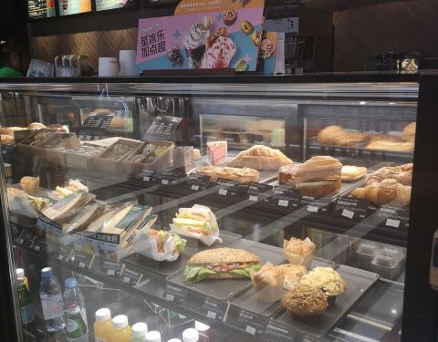 每次总是匆匆路过这里的星巴克。 金虹桥有两家星巴克,经常会搞不清楚自己所在的楼层,所以这次签到又搞错了。 位于b2的这家处于转角位置,没有座位可坐。 不过平时路过,看到生意什么还是挺好的。 今天台风天,顾客少了,而且橱柜里留下的实物在晚上还有很多呢。