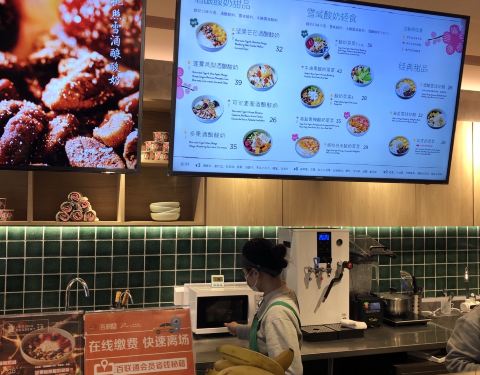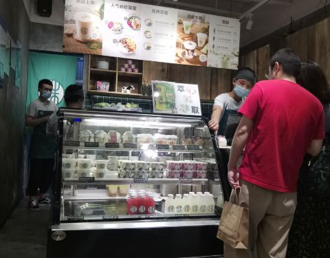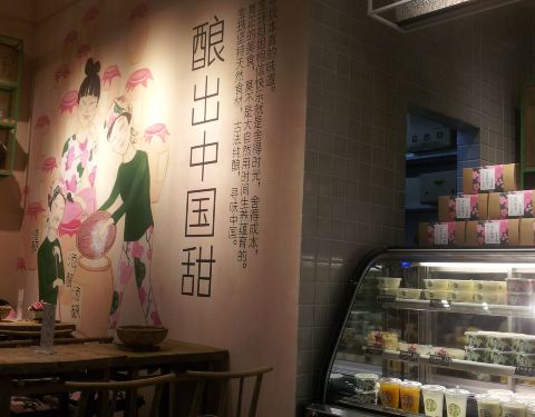 一家装饰非常漂亮、陈设古朴自然的知名甜品连锁餐厅,位于商城一楼,临街铺面,这里售卖的各类甜品都选用纯天然食材、手工制作,健康味美。