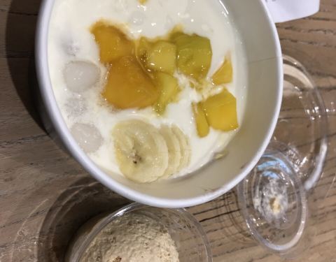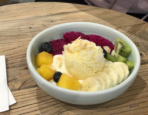 过来休息一下儿,点了他们家的酸奶菜菜,里面放火龙果、奇异果、蓝莓和各种谷物的那款,上面还浇了一点巧克力酱。一份酸奶菜菜里面的配料还是很丰富的,所以口感也很不错,里面的酸奶味道醇厚,搭配水果和坚果挺好吃的。