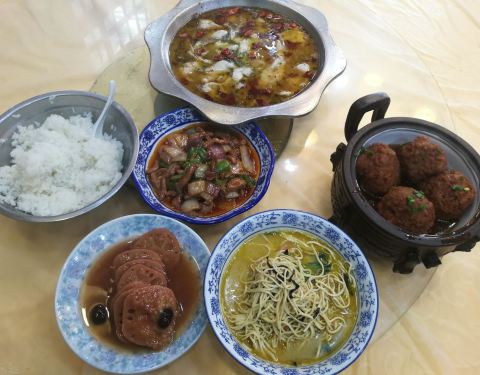 在汤山汤泉路一条全是饭馆的街上,能够生存并生意不错,路边可以停车。门头很高,要上几个台阶。店铺其实不大,中午去居然还要等位。菜都是家常菜,但是份量很足,狮子头面粉多点所以个头很大。酸菜鱼鱼比酸菜多...