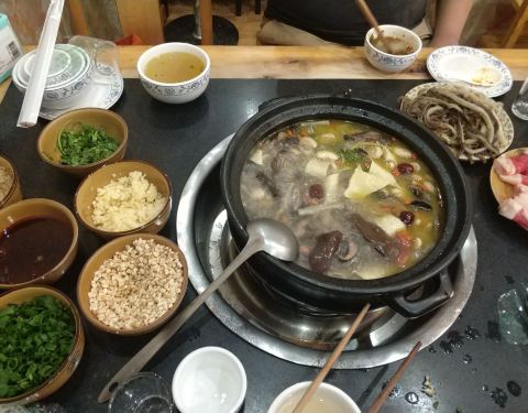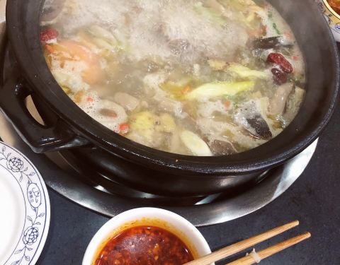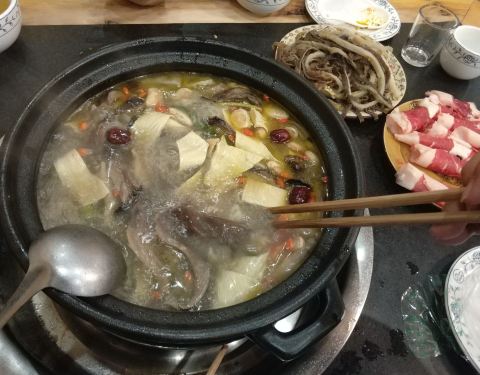 店在二楼上,几乎座无虚席,分为大、中、小锅三种,我们只有三人,点菜,菌汤锅底,上锅先喝汤,汤头鲜美,下肉、菜后味道一般了,价位中等,人均60元。