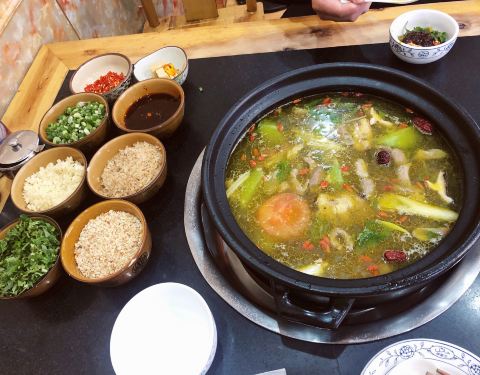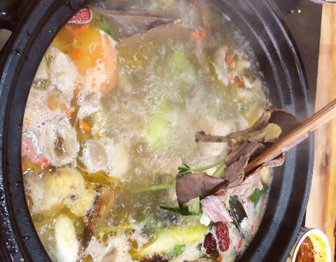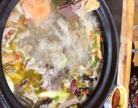 高原特色全牛汤锅(牦牛头皮、牛杂、牛尾、牛鞭)。