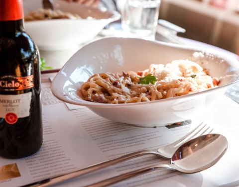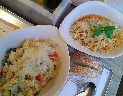 good pasta in cozy terrace both lunch and dinner. if my memories were correct, it was under or around 20euros for pasta and wine.