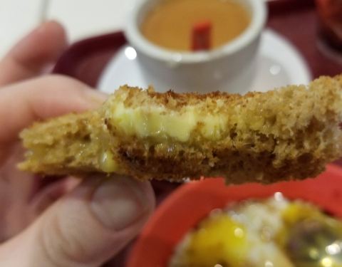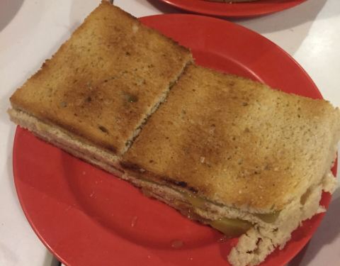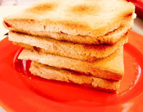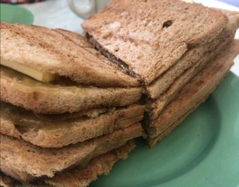 ...很薄,在吐司中割开一条隙缝夹上黄油,椰浆或芝士等,烤得半焦的吐司加上黄油,香香脆脆的,挺好吃的