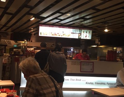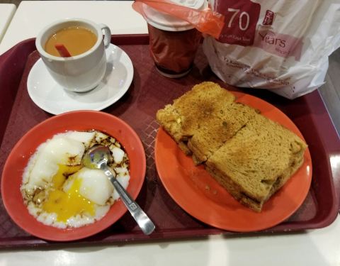 到了新加坡当然要来尝一下国民早餐啦!亚坤有很多分店,这家位于莱佛士城,在地下一楼,我们本打算从莱佛士商场进,但是商场要10点半才开门,我们真是困惑一下,原来是可以从旁边的与地铁相连的一个门进去! 进去...到了新加坡当然要来尝一下国民早餐啦!亚坤有很多分店,这家位于莱佛士城,在地下一楼,我们本打算从莱佛士商场进,但是商场要10点半才开门,我们真是困惑一下,原来是可以从旁边的与地铁相连的一个门进去! 进去转了一圈才找到,小店门面不大,去的时候也还有位子,我们就点了A和B套餐!每一份套餐都是一份吐司➕一份生熟蛋➕一份饮料,饮料可选咖啡或者奶茶! A套餐的吐司是烤吐司,B套餐是蒸吐司,两者比较一下还是烤吐司更好吃!吐司中间有加咖椰酱,偏甜! 生熟蛋就是半生不熟的鸡蛋,原本以为口味会难接受,没想到加了酱油,口味还算可以! 价格算是非常亲民了,不愧是国民早餐啊!