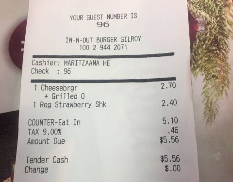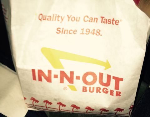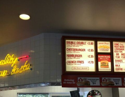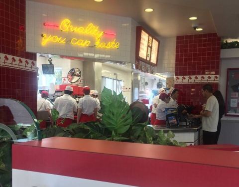 你知道吗? 美国最火的快餐连锁店是IN-N-OUT, 不是麦当劳哦。 点餐单上简简单单的就那几款,店里店外却忙得不可开交, 里面堂食的坐满人,外面等外卖的车队排了一大圈, 他们经常要请人做工(约13美金一小时)