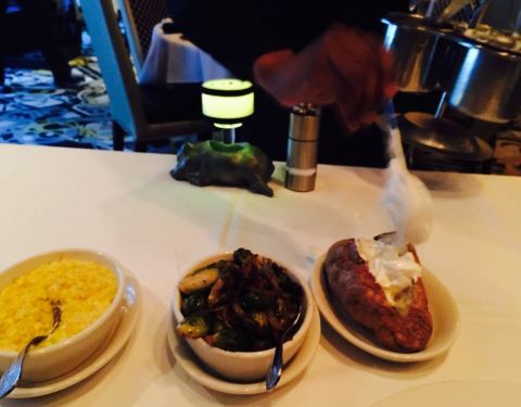 一个清脆新鲜蟹肉冷盘开始之前完全煮熟的柳布鲁塞尔豆芽和土豆泥。牛排和莫尔顿总是按时交货
