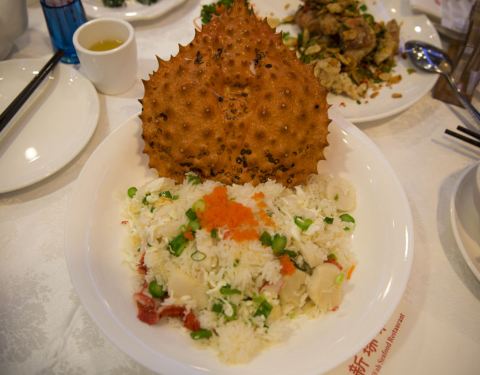 网红店“新瑞华”,店里的特色是阿拉斯加的帝王蟹,一蟹三吃,蟹爪是蒜泥清蒸的,蟹身是椒盐的,蟹壳是炒饭,一只蟹大约6.5磅,整个饭店全是中国吃货,都忘了身在异乡,还以为在中国某个饭店。